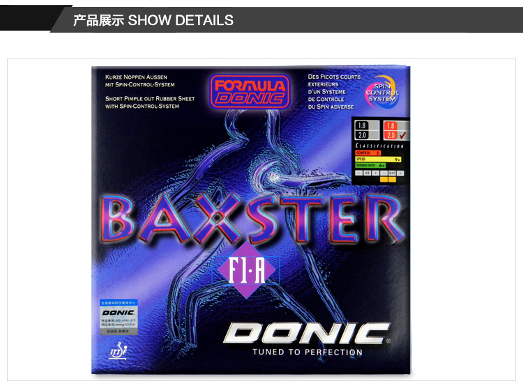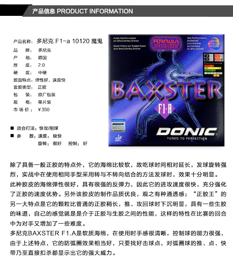 • 多尼克BAXSTER F1.A是軟質(zhì)海綿,在使用時手感很清晰,控制球的能力很強,由于上述特點,它的防弧圈效果相當好,只要找好擊球點,對弧圈球的推、點、快帶乃至直接扣殺都顯示出它的強大威力。