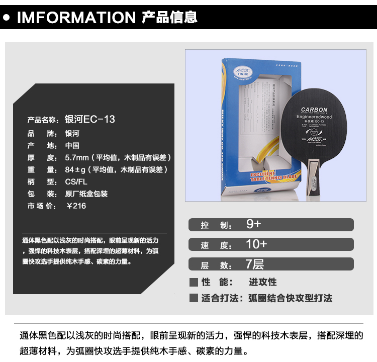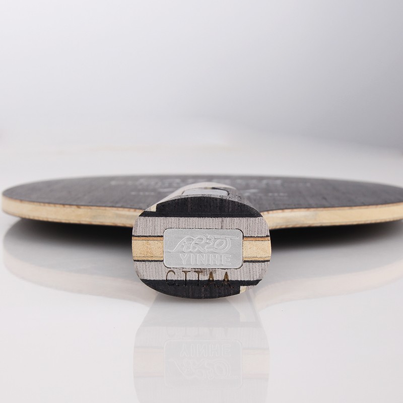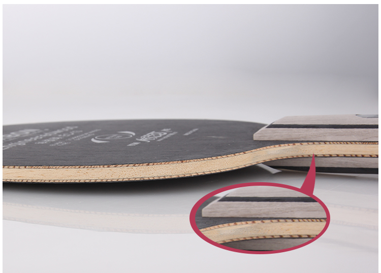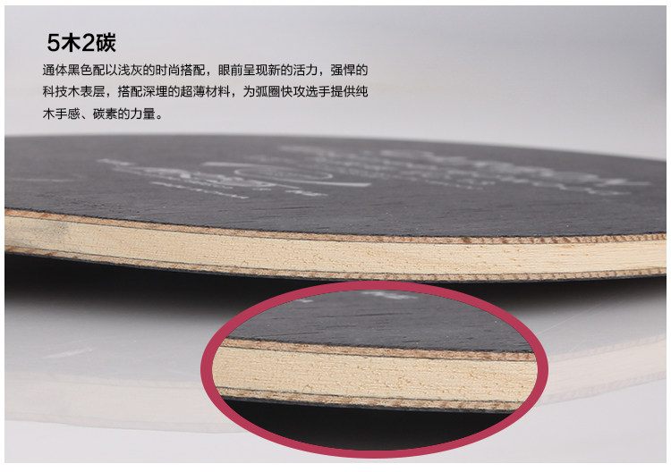 通體黑色配以淺灰的時尚搭配,眼前呈現(xiàn)新的活力,強悍的科技木表層,搭配深埋的超薄材料,為弧圈快攻選手提供純木手感、碳素的力量。