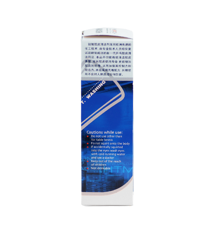銳馳膠皮清潔劑采用歐洲先進(jìn)的化工技術(shù),由專業(yè)技術(shù)人員經(jīng)反復(fù)試驗研制成功的新一代乒乓膠皮清潔劑用品,本品不但能有效清潔膠皮表面,延長膠皮使用壽命,更能能膠皮的粘性,從而加強其控制力和攻擊力。本品采用無毒配方,長期使用不會對人體造成任何傷害。