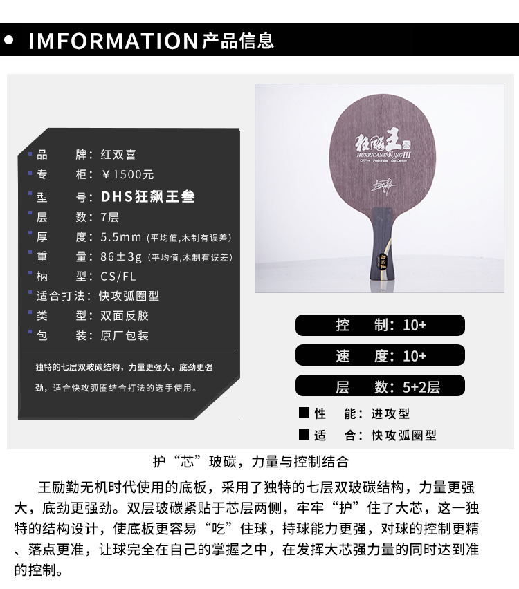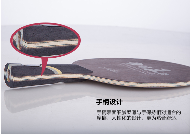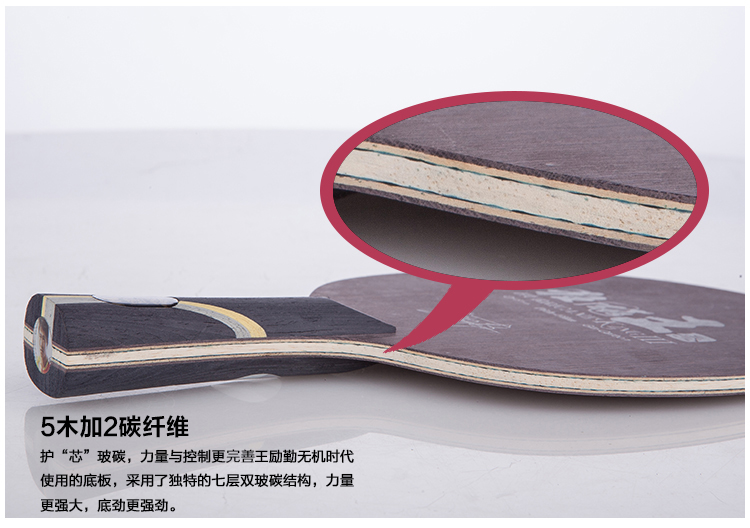 王勵(lì)勤無(wú)機(jī)時(shí)代使用的底板,采用了獨(dú)特的七層雙玻碳結(jié)構(gòu),力量更強(qiáng)大,底勁更強(qiáng)勁。雙層玻碳緊貼于芯層兩側(cè),牢牢“護(hù)”住了大芯,這一獨(dú)特的結(jié)構(gòu)設(shè)計(jì),使底板更容易“吃”住球,持球能力更強(qiáng),對(duì)球的控制更精準(zhǔn)、落點(diǎn)更準(zhǔn)確,讓球完全在自己的掌握之中,在發(fā)揮大芯超強(qiáng)力量的同時(shí)達(dá)到完美的控制。