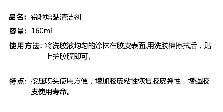 - 商品名稱:銳馳增粘膠皮保養(yǎng)液清洗液清潔劑清洗劑 160ML (含一塊洗膠棉)