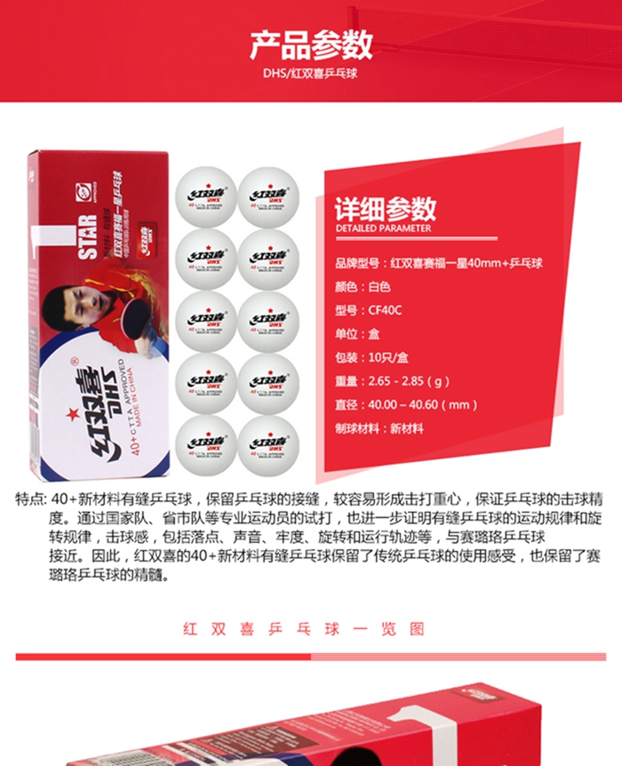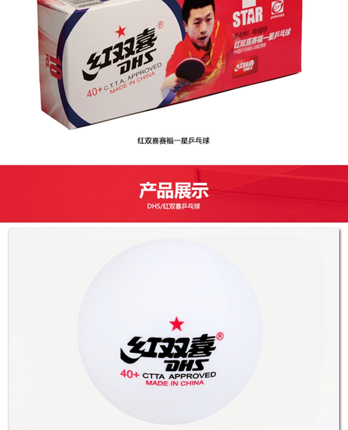 產(chǎn)品名稱:紅雙喜DHS賽福一星40+新材料有縫乒乓球