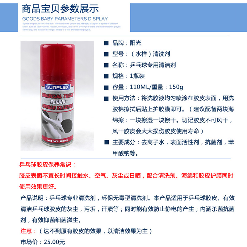 產(chǎn)品名稱(chēng):陽(yáng)光SUNFLEX 專(zhuān)用乒乓球膠皮清潔劑