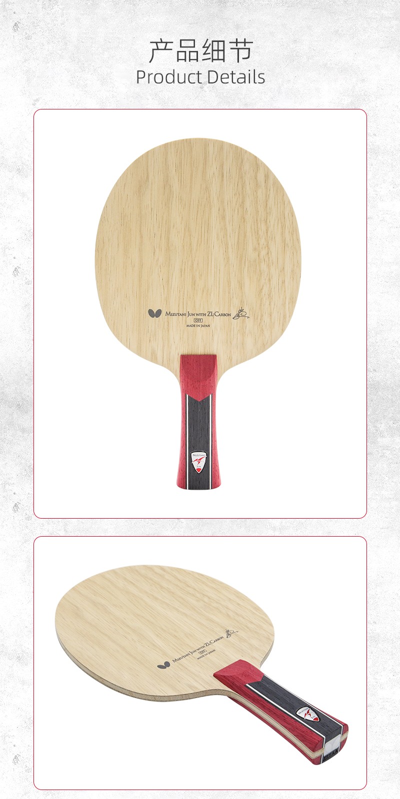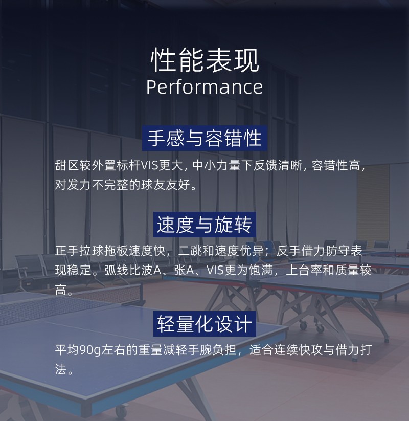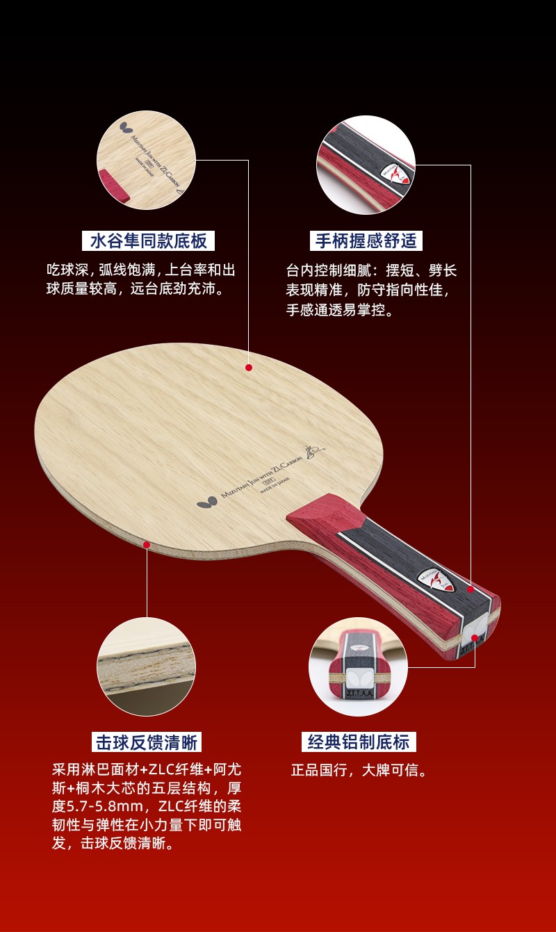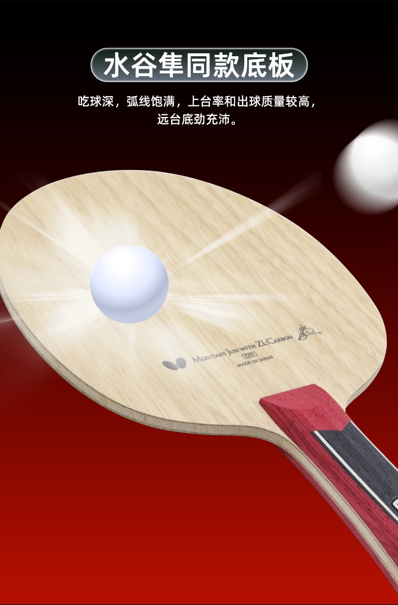 搭載了特殊的ZL素材的高性能底板。推薦給如水谷凖選手般在前臺(tái)至遠(yuǎn)臺(tái)間都能打出變化多段的愛(ài)好者。