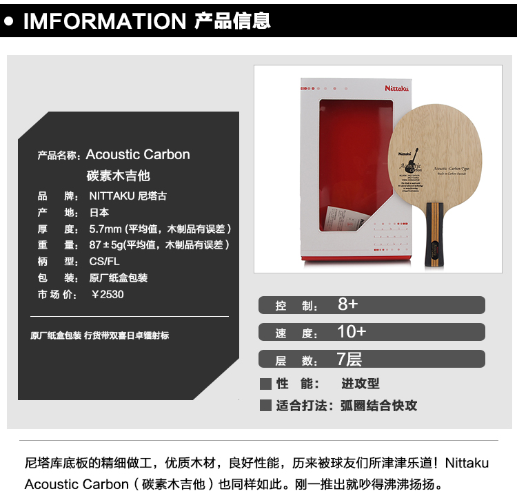 產(chǎn)品名稱:尼塔庫(kù)Nittaku 碳素木吉他 弧圈快攻型底板