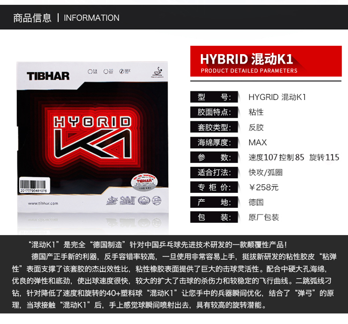 混動K1 是挺拔針對中國先進(jìn)乒乓球技術(shù)研發(fā)的一款純“德國制造”的顛覆性產(chǎn)品。套膠使用了挺拔最新研發(fā)的“粘彈性”表面來支撐該套膠杰出的效性比。德式的粘性表皮配合中硬大孔海綿,將激發(fā)出套膠優(yōu)良的彈性和底勁,飛快的出球速度,極大的擴(kuò)大了擊球的殺傷力和穩(wěn)定的飛行曲線。刁鉆的二跳弧線,針對新材料40+乒乓球,瞬間優(yōu)化您的器材性能。