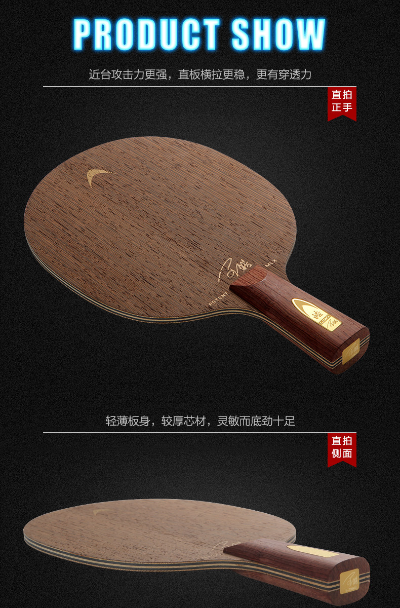 快攻弧圈型七層純木結(jié)構(gòu),速度??刂?、弧圈能力出色的平衡,優(yōu)雅的黑檀實木手柄,舒適的握感與重心。