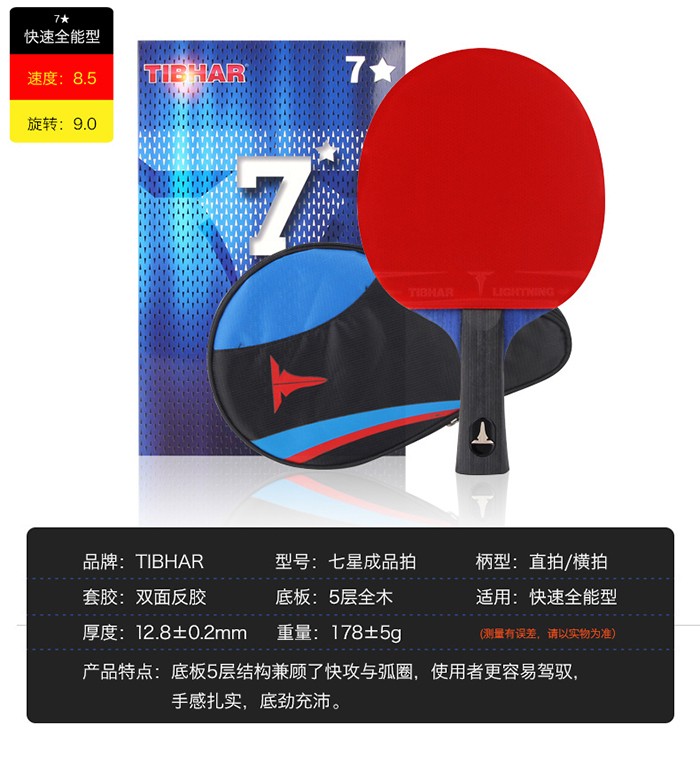 商品名稱:挺拔Tibhar 七星成品拍 5層純木結(jié)構(gòu)(雙面反膠+乒乓球2粒+葫蘆單拍套)