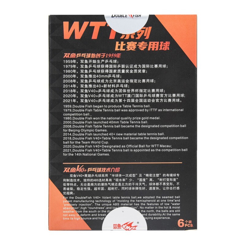 - 商品名稱:雙魚Doublefish WTT系列賽事用球 新材料40+三星比賽球(6只/盒)白色