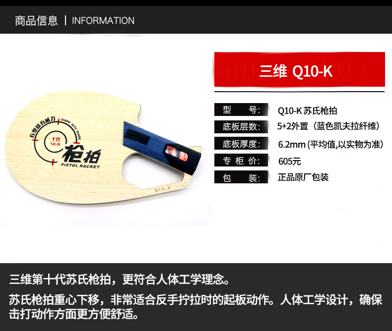 - 商品名稱:三維Sanwei Q10-K 第十代蘇氏槍拍 專業(yè)乒乓底板 5+2外置結(jié)構(gòu)