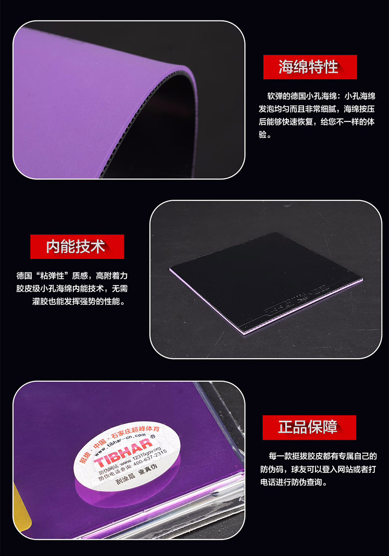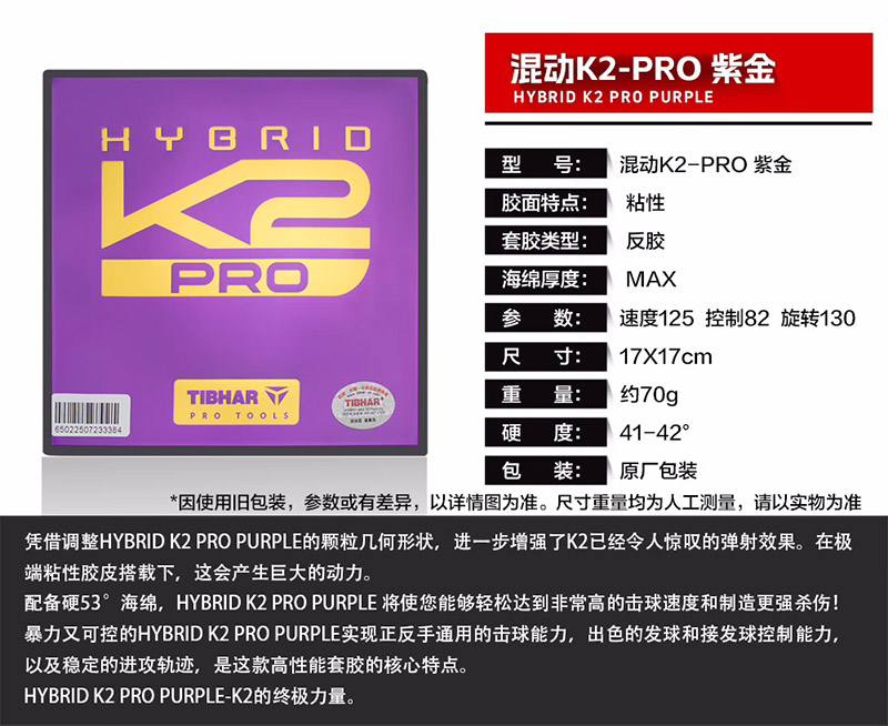 - 商品名稱:Tibhar挺拔K2Pro紫金k2乒乓球膠皮專業(yè)粘性反膠套膠