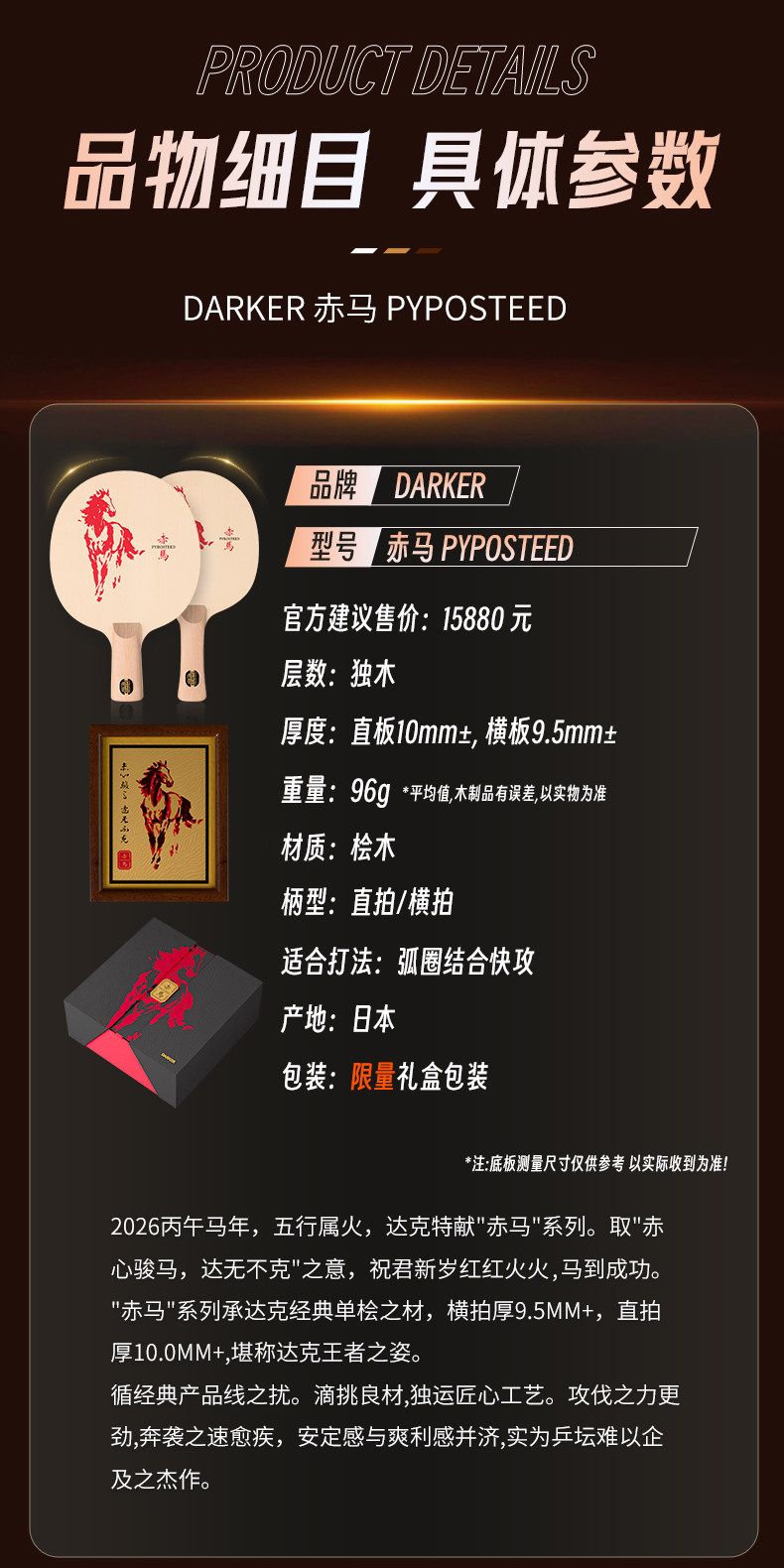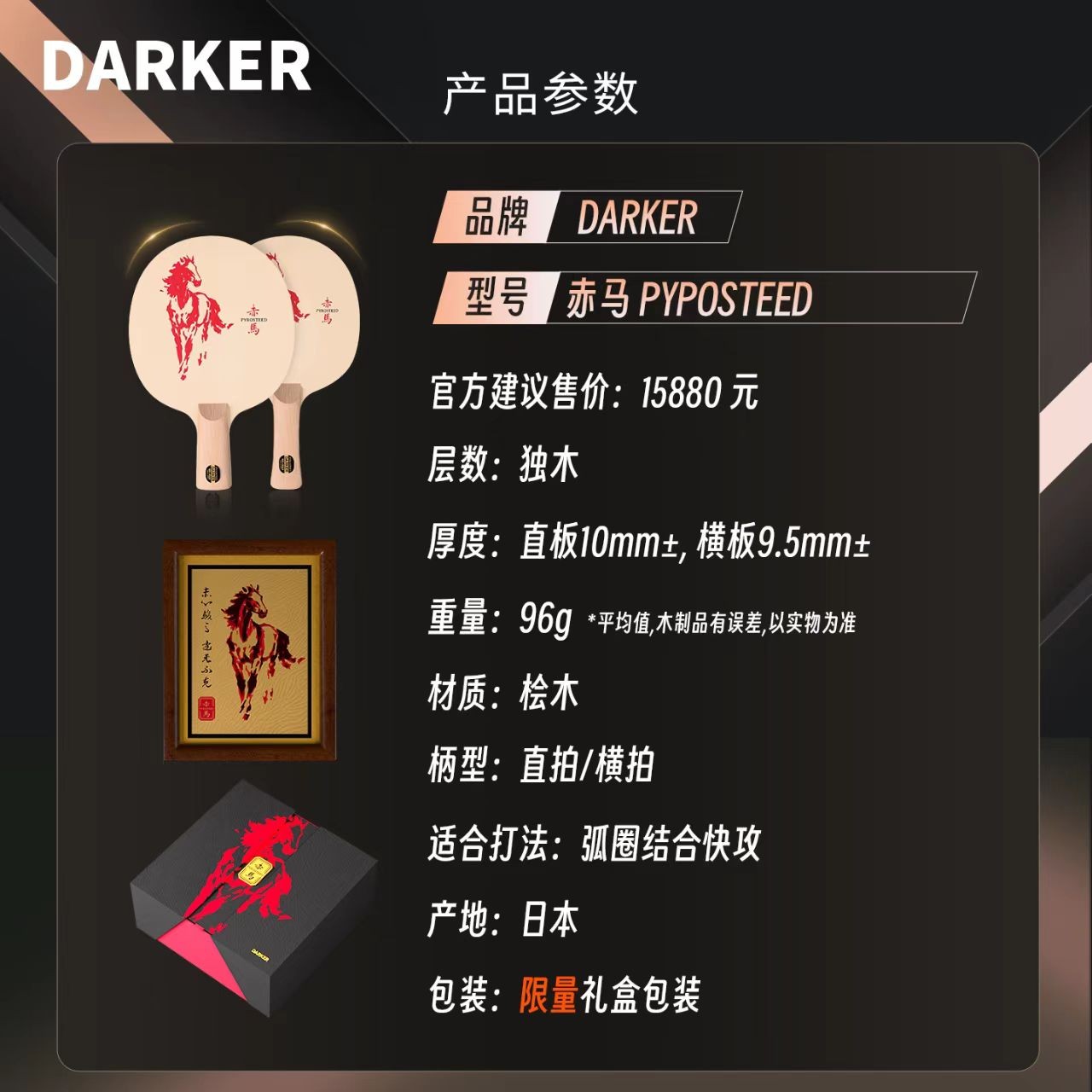 - 商品名稱:【全球限量60支】DARKER達(dá)克赤馬乒乓球拍底板單檜百年檜木新年送禮高端禮盒乒乓底板