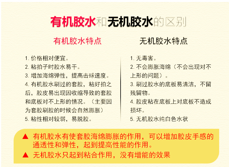 從2004年日本乒協(xié)首次提出禁止使用有機(jī)膠水,到2008年禁膠令的全面開(kāi)始,廣大球友也都在實(shí)時(shí)的體會(huì)到了從有機(jī)膠水到無(wú)機(jī)膠水的轉(zhuǎn)變,無(wú)機(jī)時(shí)代已經(jīng)來(lái)領(lǐng)了,那么無(wú)機(jī)膠水和有機(jī)膠水到底有什么不同呢?