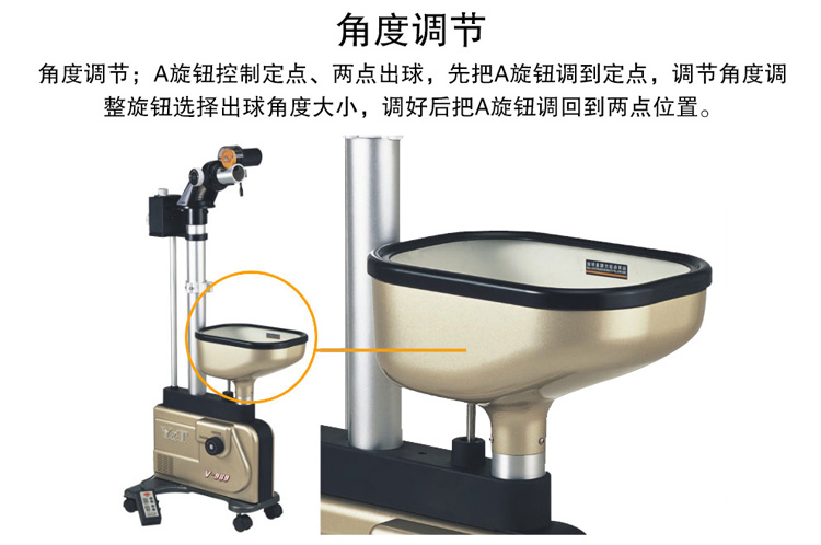 3、角度調(diào)節(jié);A旋鈕控制定點(diǎn)、兩點(diǎn)出球,先把A旋鈕調(diào)到定點(diǎn),調(diào)節(jié)角度調(diào)整旋鈕選擇出球角度大小,調(diào)好后把A旋鈕調(diào)回兩點(diǎn)位置。